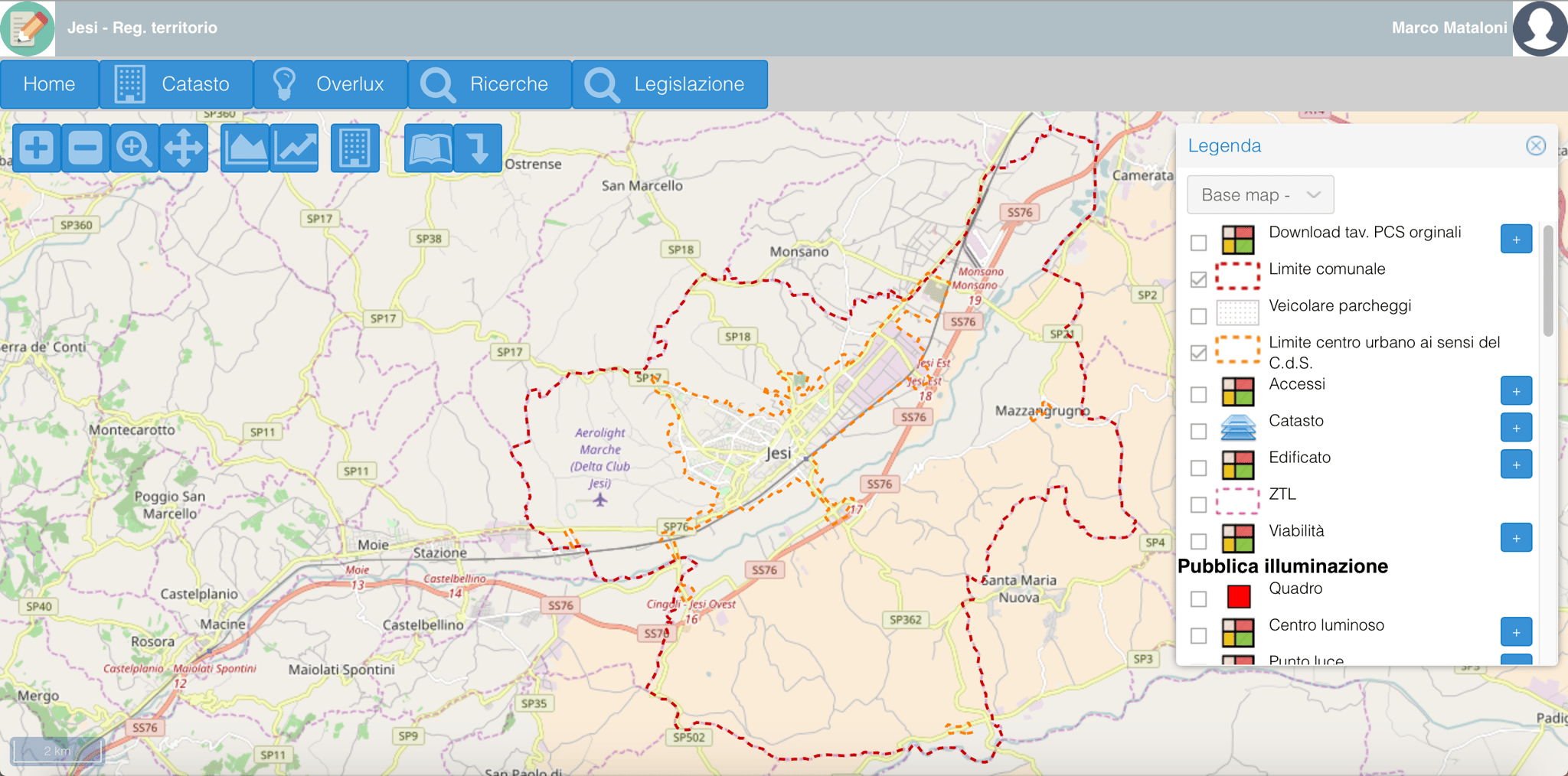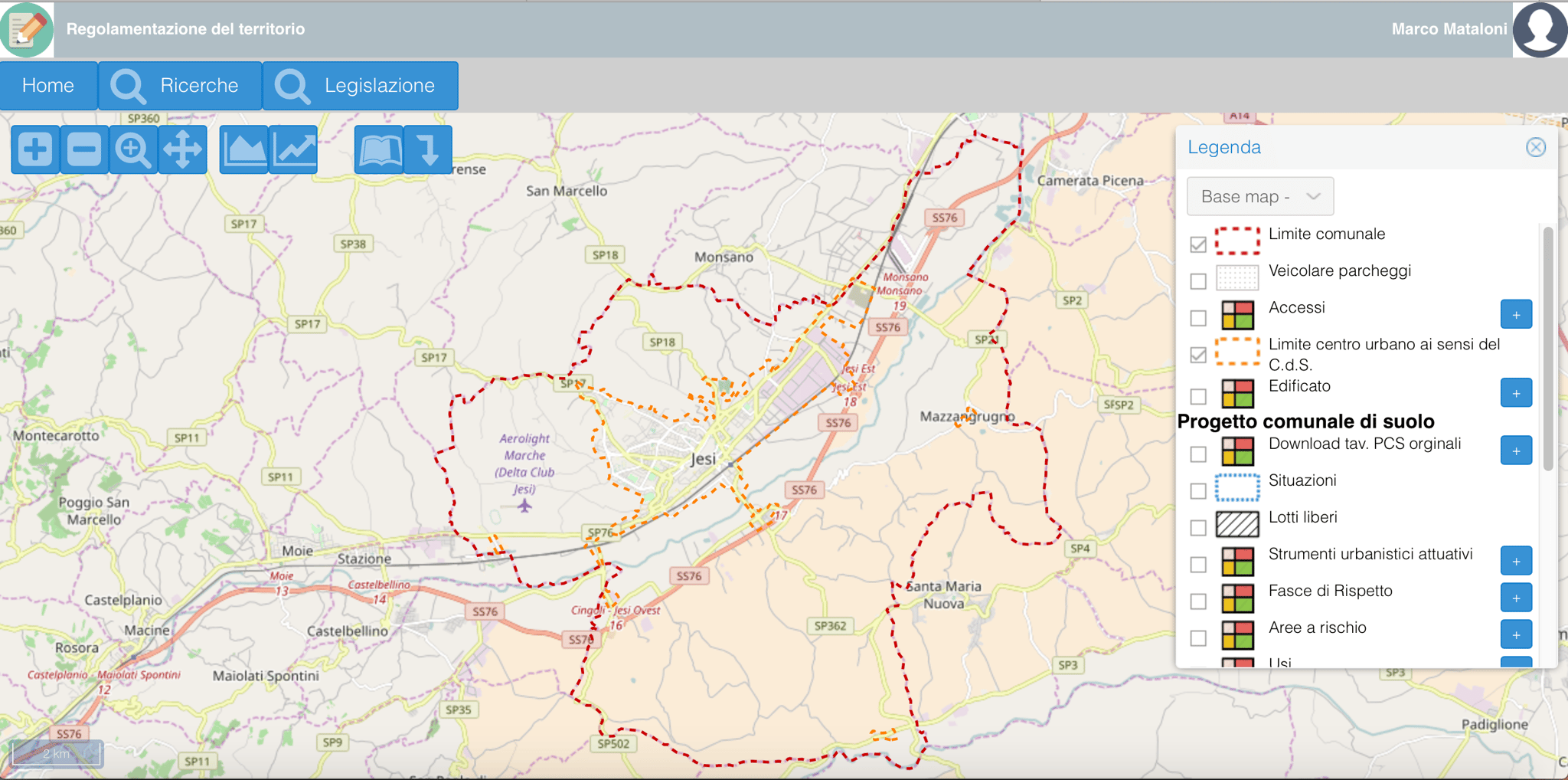Navigazione cartografica tramite strumenti di zoom, pan, gestione dei livelli, funzioni base di misura area e distanza e stampa di stralci